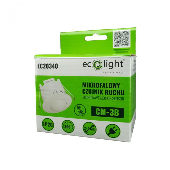 CM-3B to zaawansowany, niezawodny i profesjonalny mikrofalowy czujnik ruchu, który zapewnia efektywną i bezproblemową kontrolę oświetlenia. Bez trudu dopasowuje się do różnych wnętrz, w tym domów, biur i magazynów. Dzięki swojej białej powłoce, harmonijnie wtapia się w otoczenie. Istotnymi parametrami czujnika CM-3B są: maksymalna moc obciążenia: 600W, maksymalny zasięg: 8m, kąt wykrywania ruchu: 360°, szybkość wykrywania ruchu: 0,6-1,5 sekundy.