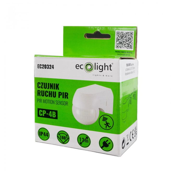 Czujnik ruchu PIR CP-4B, firmy ECOLIGHT do zamontowania na ścianie bądź suficie, w kolorze białym, ruchomy.