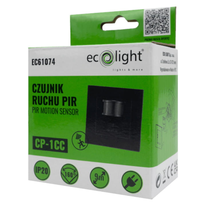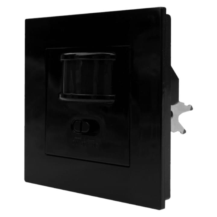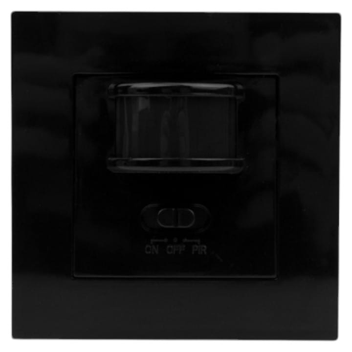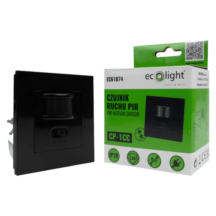 Podtynkowy czujnik ruchu PIR CP-1CC w kolorze czarnym, firmy ECOLIGHT, przeznaczony do montażu w puszce elektrycznej.