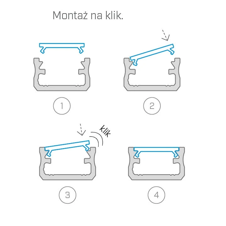 Nie należy montować taśm LED IP65 w profilu z zamontowanym kloszem. Montaż =może doprowadzić do uszkodzenia zamontowanej taśmy LED oraz klosza, jak również utratę gwarancji.