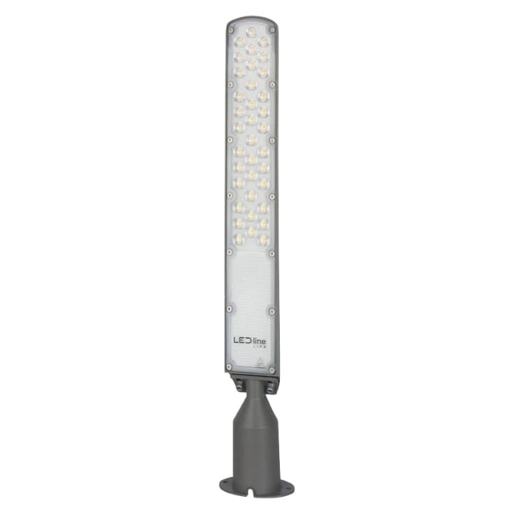 Lampa uliczna firmy LED-LINE o mocy 100W, jasności 10000 lumenów, w neutralnej barwie światła, w szarej obudowie.