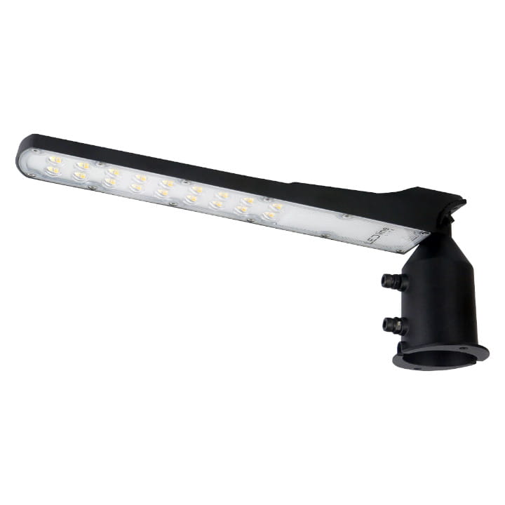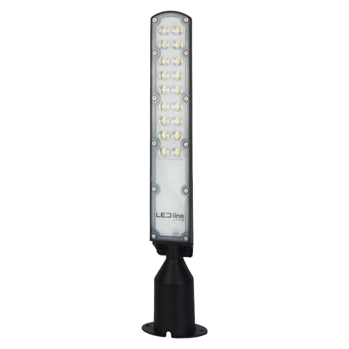Lampa uliczna LED-LINE ma moc 50W, świeci z jasnością 5000 lumenów w neutralnym tonie i jest w szarej obudowie.