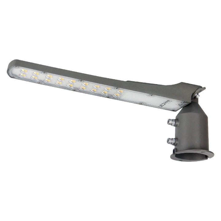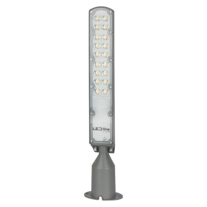Uliczna lampa marki LED-LINE posiada moc 50W i emituje światło o jasności 5000 lumenów w neutralnym odcieniu. Całość jest zamknięta w obudowie koloru szarego.