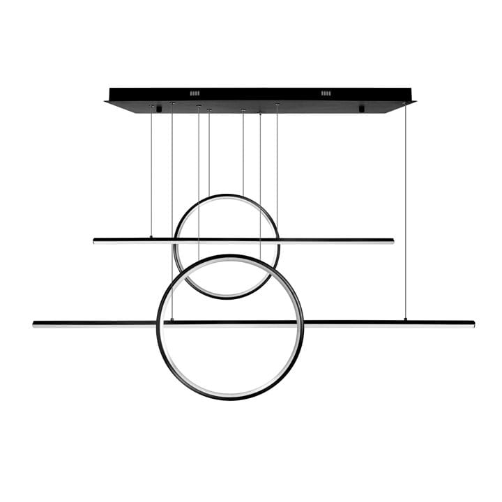 Wisząca lampa ledowa DL-G07 o mocy 75W, jasności 6000 lumenów, w barwie światła neutralnej, w kształcie czarnych okręgów.