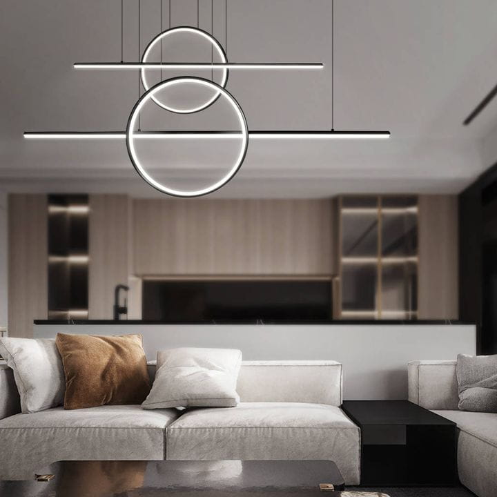 Wiszące okręgi to lampa LED marki SYNTHRON, która ze względu na swój oryginalny kształt wpasuje się do pomieszczeń w stylu nowoczesnym.