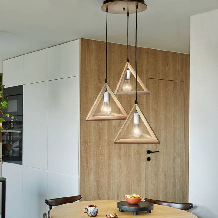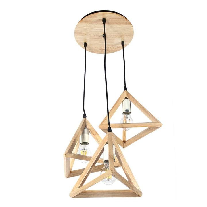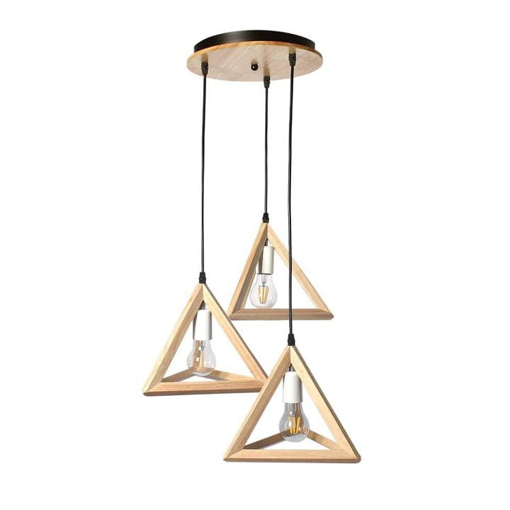 Lampa wisząca LED drewniana składająca się z 3 trójkątów, które przystosowane są na żarówki z gwintem E27.