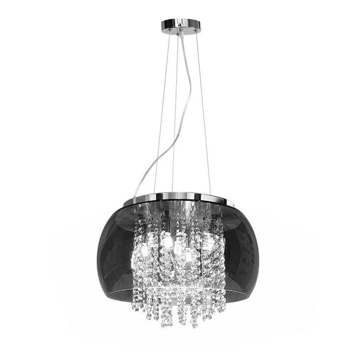 Lampa wisząca przystosowana na pięć żarówek z trzonkiem G9. Klosz lampy posiada efekt przydymionego lustra. Z powodzeniem można zamontować lampę w klasycznych i nowoczesnych pomieszczeniach. Szklane drobne korale to główny element dekoracyjny lampy. Dodają nietuzinkowego efektu świetlnego. Lampę wiszącą można zamontować w kuchni, salonie, sypialni, a także w restauracji. Długość zawiesi jest regulowana, do 100cm wysokości.
