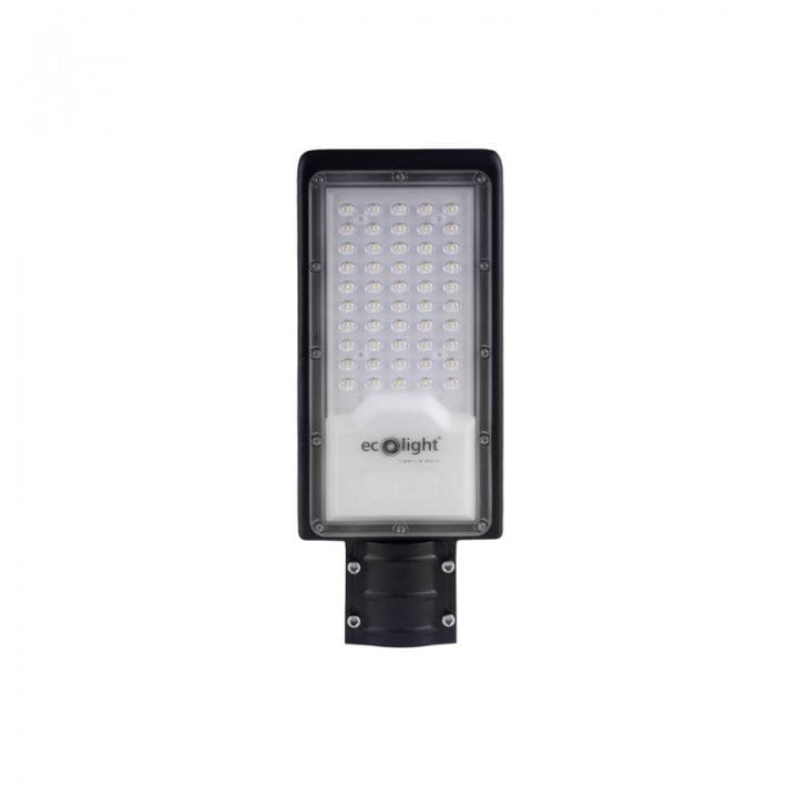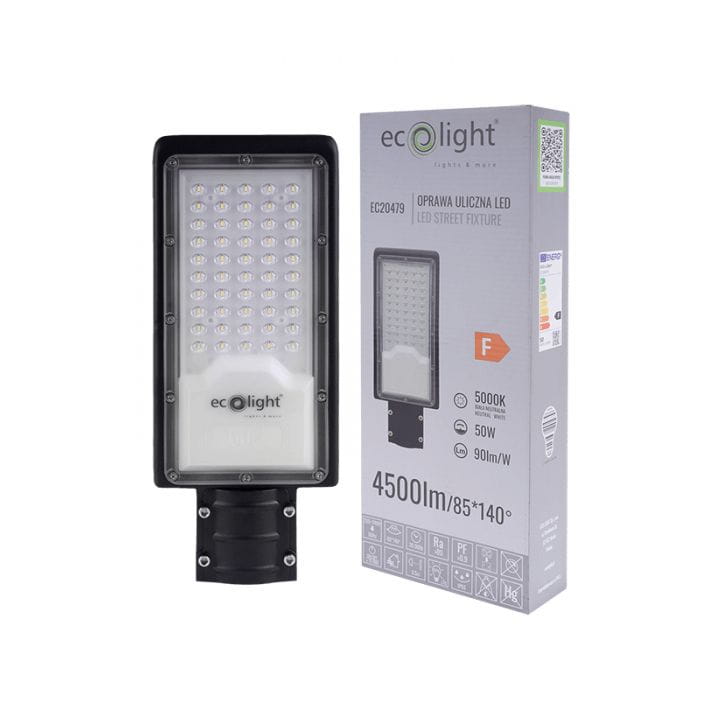 Lampa uliczna firmy ECOLIGHT o mocy 50W, jasności 4500 lumenów, w dziennej barwie światła.