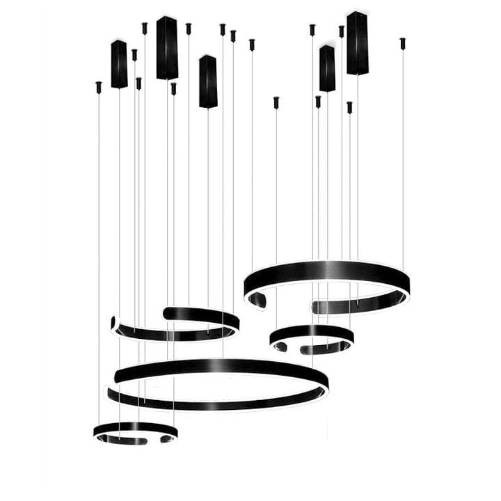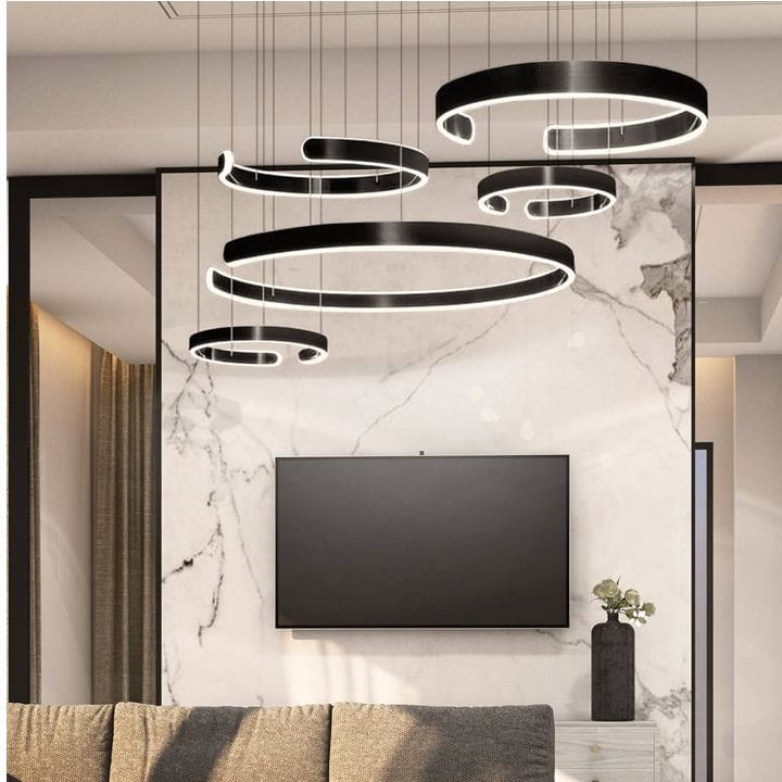 Lampa wisząca premium to nowoczesna lampa, która została wykonana z wysokiej jakości materiałów. Swoim kształtem doskonale wpasuje się do dużych pomieszczeń, w nowoczesnym stylu. Można ją zamontować w przestrzeni biurowej lub w salonie. Lampa składa się z pięciu czarnym okręgów, których jasność to aż 21120 lumenów. Za pomocą dołączonego pilota można ustawić barwę ciepłą, neutralną lub zimną.