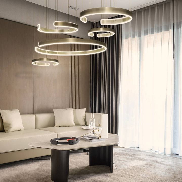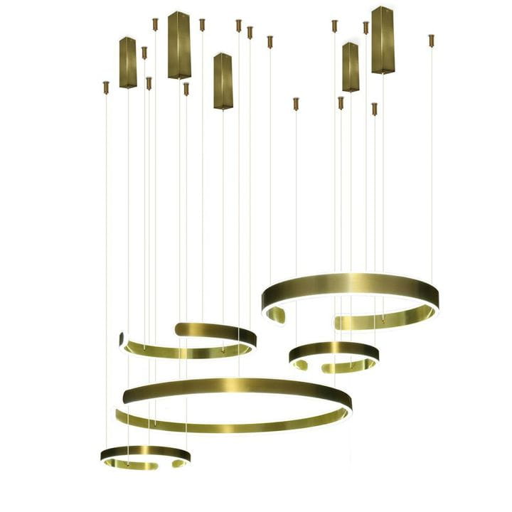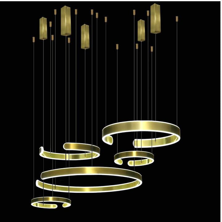 Nowoczesna lampa została wykonana z wysokiej jakości materiałów. Swoim kształtem doskonale wpasuje się do dużych pomieszczeń, w nowoczesnym stylu. Można ją zamontować w przestrzeni biurowej lub w salonie. Lampa składa się z pięciu złotych okręgów o szerokości 80cm, 60cm, 40cm, 30cm oraz 30cm. Za pomocą dołączonego pilota można ustawić barwę ciepłą, neutralną lub zimną.