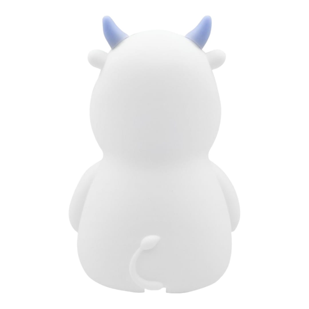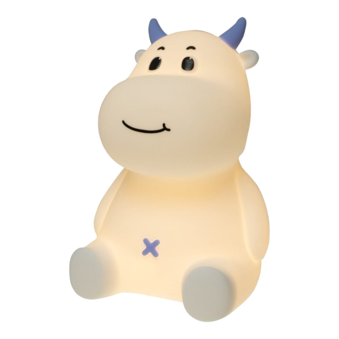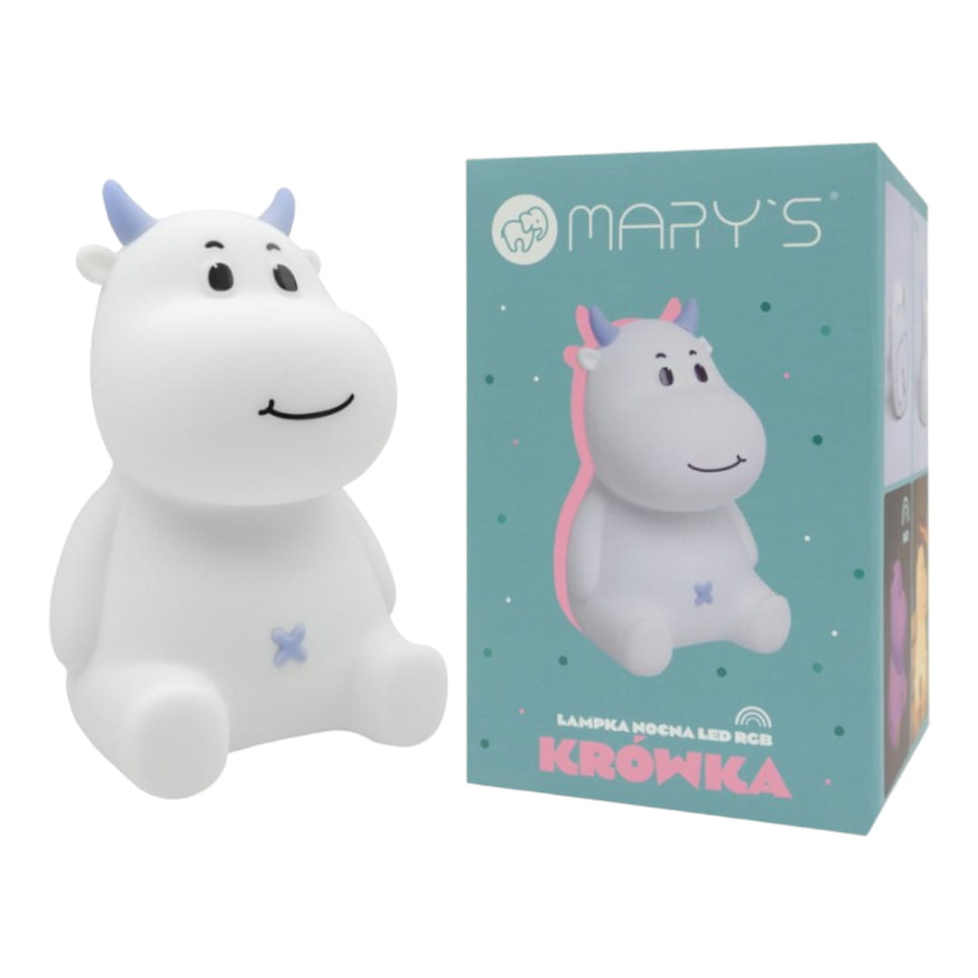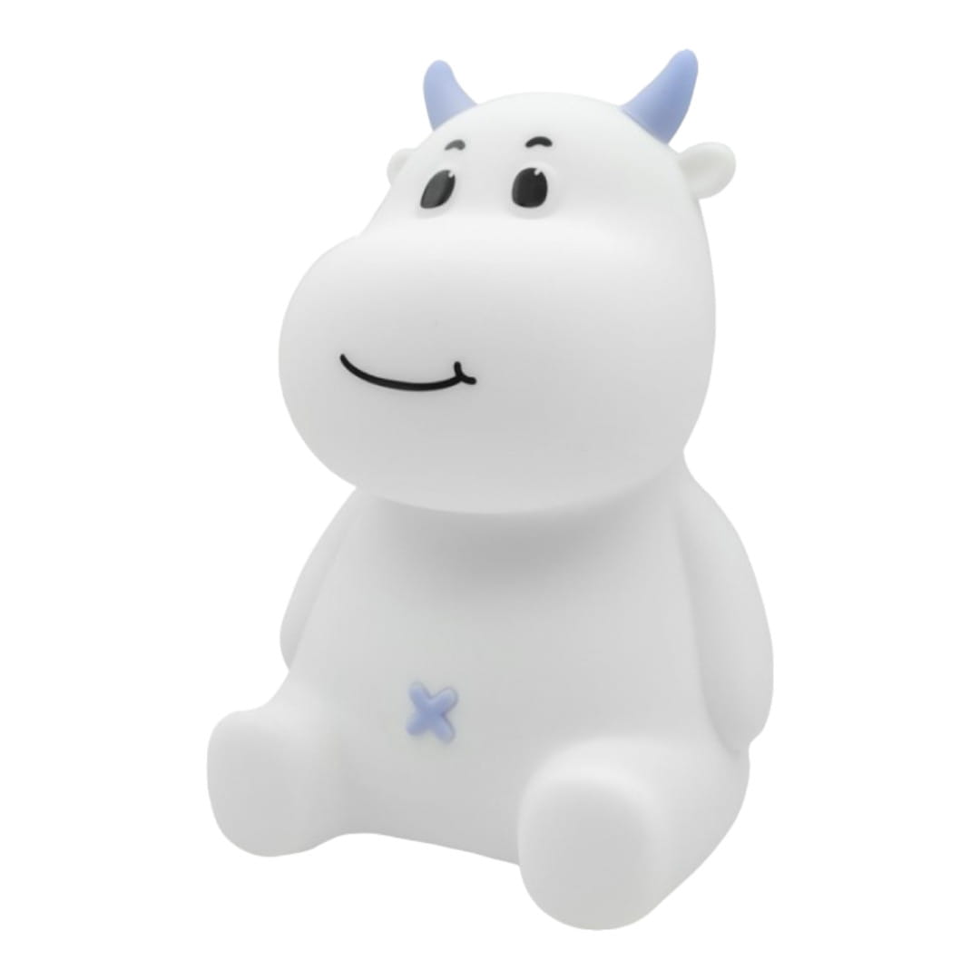 Lampka nocna LED dziecięca w kształcie krówki marki MARY'S, w pastelowym odcieniu niebieskiego.