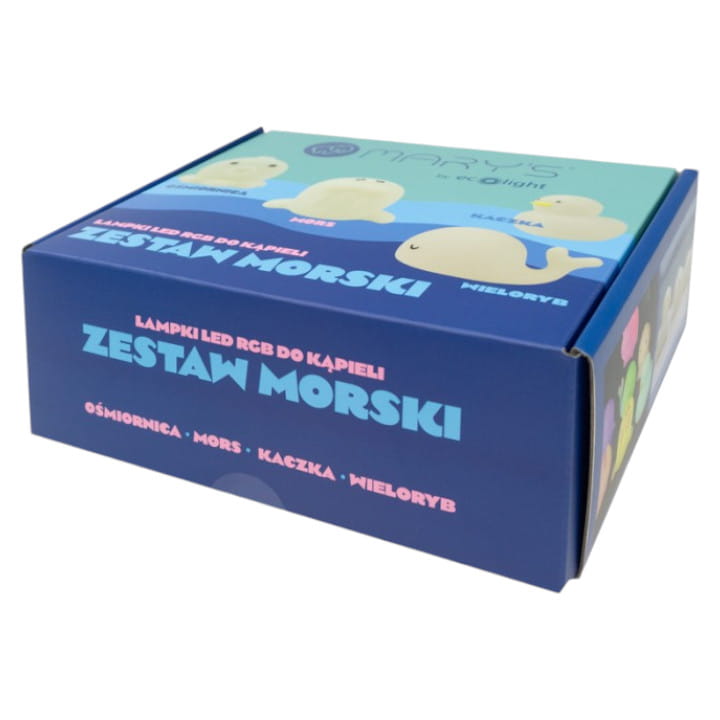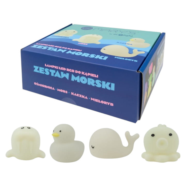 Zestaw Morski RGB od Mary's składa się z czterech lampek nocnych: kaczuszki, wieloryba, morsa i ośmiornicy.