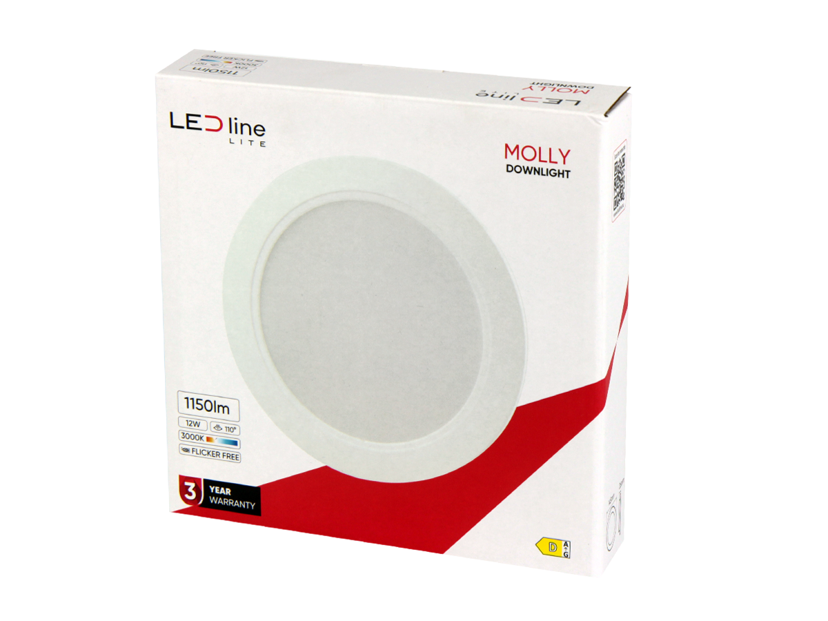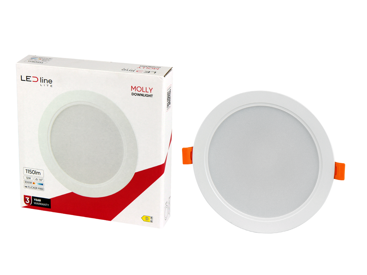 Lampa LED MOLLY, o mocy 12 Watt i jasności 1150 lumenów, w barwie światła 3000K, sprawdzi się jako sufitowe oświetlenie punktowe z ciepłą barwą światła do biura, gabinetu, kuchni, korytarza, łazienki oraz pokoju.