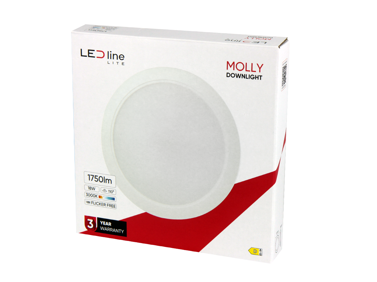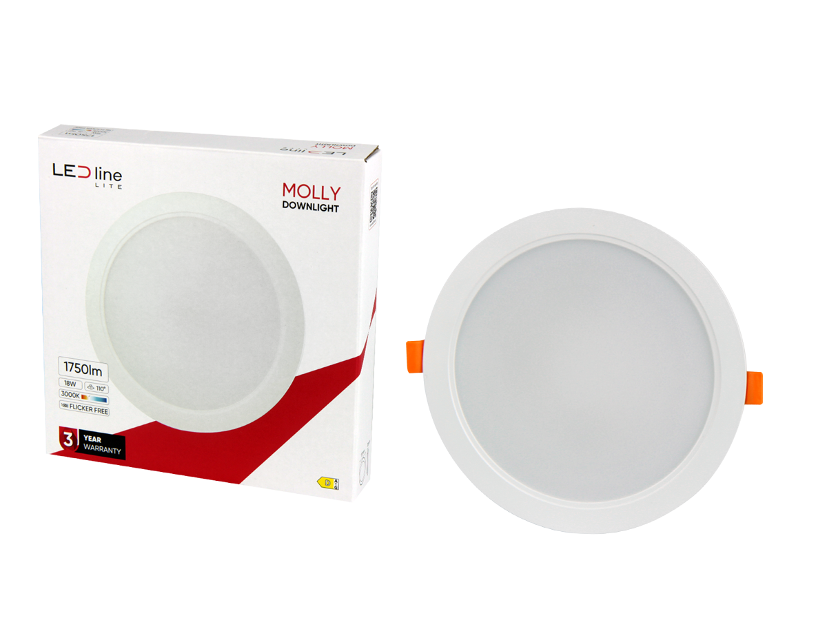 Lampa LED MOLLY, o mocy 18 Watt i jasności 1750 lumenów, w barwie światła 3000K, sprawdzi się jako jasne sufitowe oświetlenie punktowe z ciepłą barwą światła do biura, gabinetu, kuchni, korytarza, łazienki oraz pokoju.