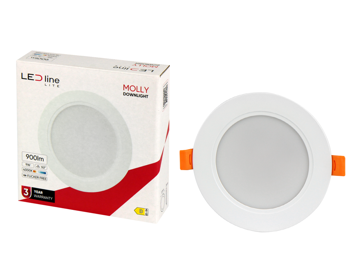 Lampa LED MOLLY, o mocy 9 Watt i jasności 900 lumenów, w barwie światła 4000K, sprawdzi się jako sufitowe jasne oświetlenie punktowe z neutralną barwą światła do biura, gabinetu, kuchni, korytarza, łazienki oraz pokoju.