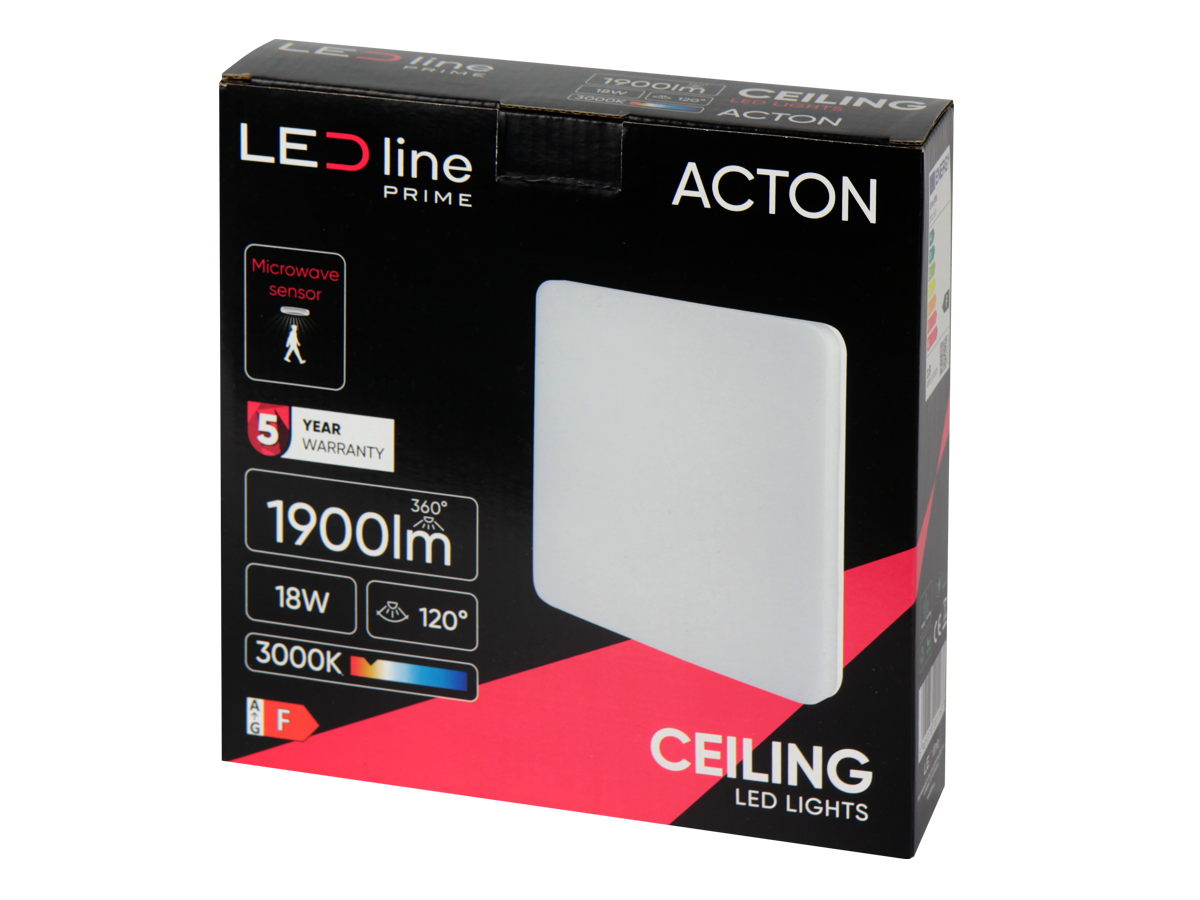 Plafon LED Line ACTON o mocy 18 Watt i jasności aż 1900 lumenów, sprawdzi się jako jasna przysufitowa lampa LED z czujką ruchu do oświetlenia pomieszczeń w przyjemnej ciepłej barwie światła.