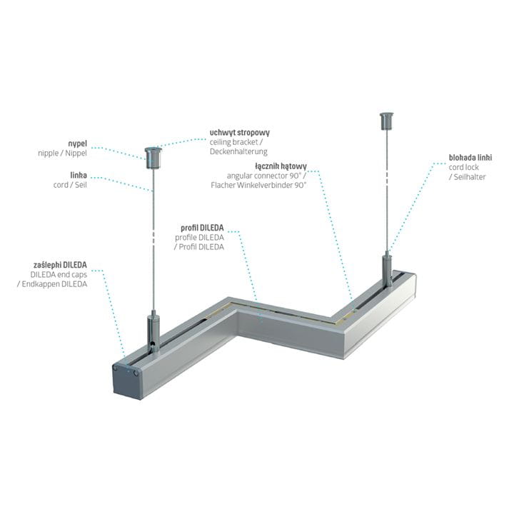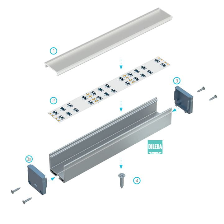 Nawierzchniowy profil aluminiowy DILEDA można zamontować za pomocą wkrętów montażowych lub taśmy dwustronnej. Wykorzystując specjalne zawisie - profil może stać się oświetleniem wiszącym. Profil DILEDA sprawdzi się jako: oświetlenie liniowe w biurach, oświetlenie stołów w salach konferencyjnych, oświetlenie luster w gabinetach kosmetycznych. Z powodzeniem można również zamontować go w pomieszczeniach mieszkalnych, jako oświetlenie stołu, wyspy kuchennej, salonu czy klatki schodowej.