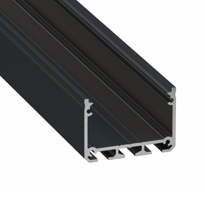 Czarny lakierowany profil aluminiowy typ ILEDO marki Lumines do oświetlenia pomieszczeń przy użyciu trzech równolegle położonych odcinków taśmy LED.