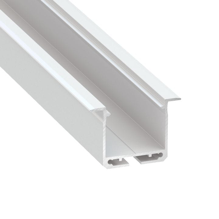 Profil LED aluminiowy typ inDILEDA wpuszczany w kolorze białym lakierowanym, o długości 2 metrów, do montażu oświetlenia z użyciem dwóch taśm LED 12mm.