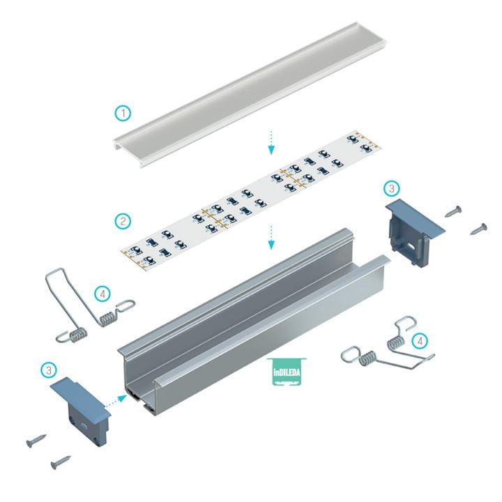 Profil LED aluminiowy inDILEDA jest profilem wpuszczanym, który można zamontować na ścianach oraz sufitach, używając sprężyn montażowych. Profil inDILEDA posiada szerokie zastosowanie. Można zamontować profil jako liniowe oświetlenie w biurach, np. oświetlenie holi, sal konferencyjnych, magazynów oraz wind.