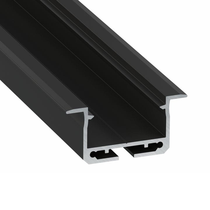 Wpuszczana listwa aluminiowa typ inSILEDA metrowa, w kolorze czarnym lakierowanym, stosowana do oświetlenia ściennego i sufitowego.
