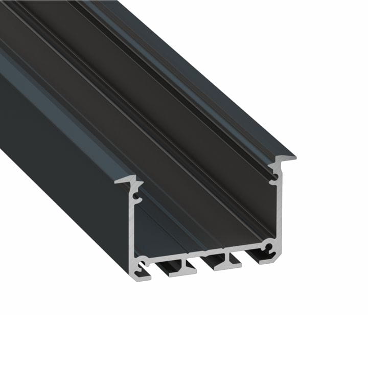 Metrowy profil LED aluminiowy typ INSO wpuszczany, w kolorze czarnym lakierowanym, montowany jako oświetlenie biurowe oraz sklepowe.