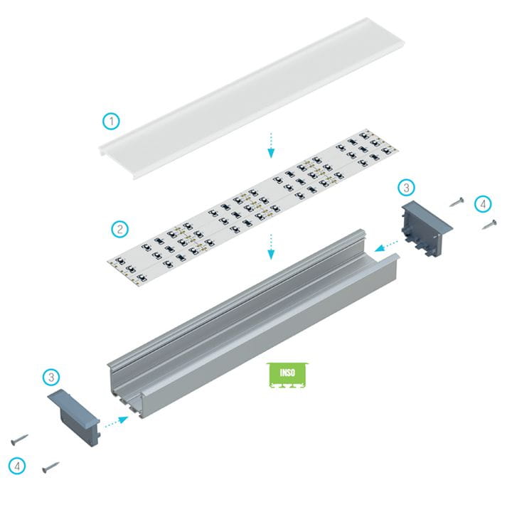 Profil INSO tworzy szerokie źródło światła, które sprawdzi się do oświetlenia biurowego i sklepowego. Będzie również doskonałą opcją do oświetlenia liniowego umieszczonego na ścianie. Sprawi, że oświetlone wnętrze nabierze nowoczesnego stylu. Profil montuje się w wyfrezowane otwory na wcisk lub za pomocą kleju montażowego. Można także do montażu zastosować sprężyny montażowe.
