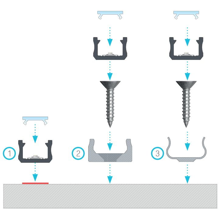 Uchwyty montażowe zostały zaprojektowane z myślą, by ułatwiały montaż profilów do ścian, szafek, czy półek. Są także ułatwieniem przy demontażu profilów. Po zamocowaniu uchwytu do wybranej powierzchni, wystarczy wcisnąć do niego profil.