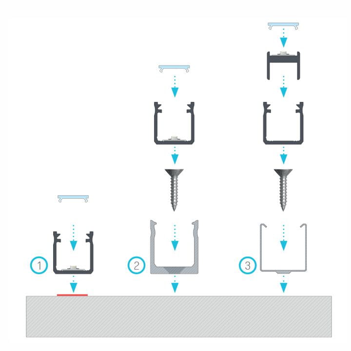 Mocowanie profilu w uchwytach ułatwia montaż i demontaż listwy LED z szafek, z pólek, ściany, czy z sufitu. Uchwyt sprawia, że montaż profilu jest szybki, tani i prosty. Po zamocowaniu uchwytu na wybraną powierzchnię, wystarczy umieścić w nim profil.