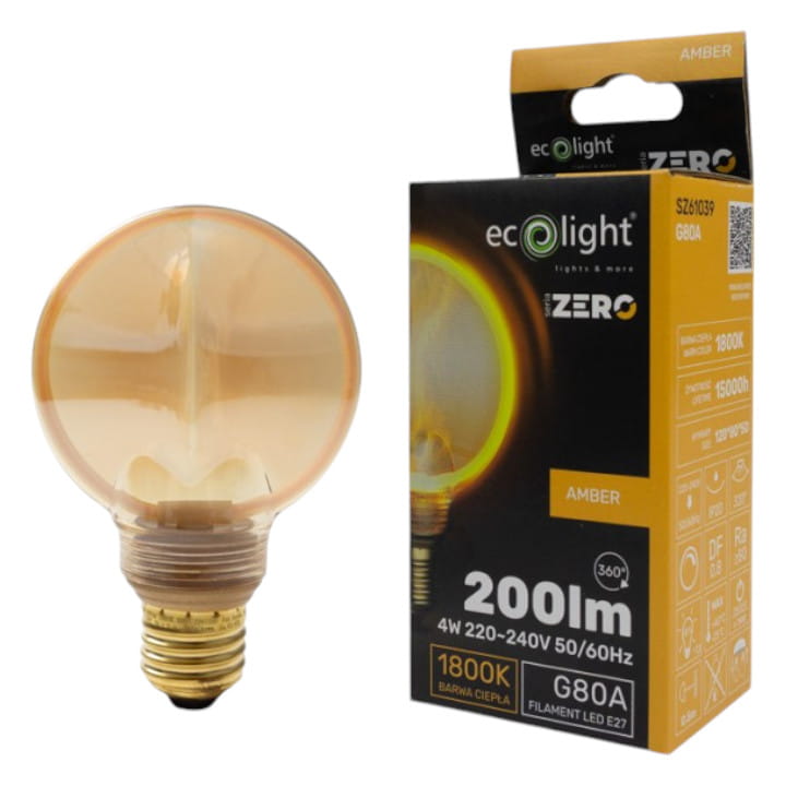 Żarówka LED AMBER z gwintem E27 G80, charakteryzuje się mocą 4 W, ultraciepłą barwą światła o temperaturze 1800K i jasnością wynoszącą 200 lumenów.