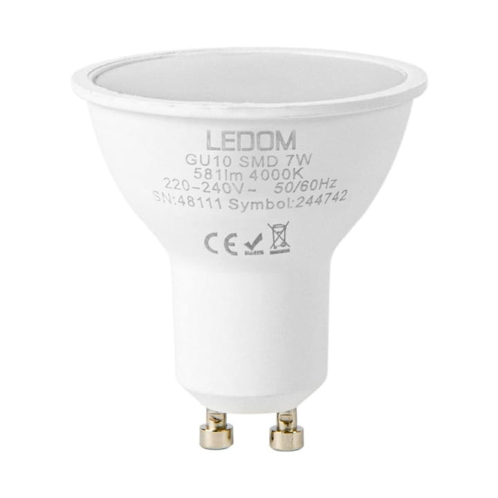 Żarówka w technologii LED z gniazdem GU10 marki LEDOM bez efektu migotania, polecana do pomieszczeń biurowych oraz warsztatowych.