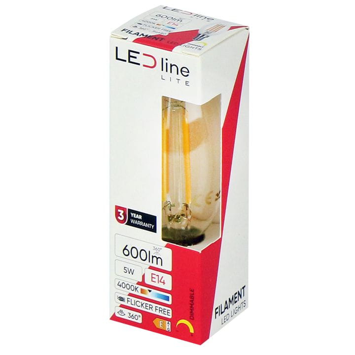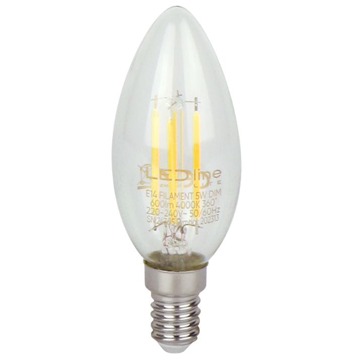 Żarówka LED LITE Filament C35 z małym gwintem E14 marki LED-LINE do zastosowań wewnątrz pomieszczeń, z możliwością ściemniania.