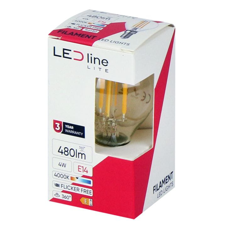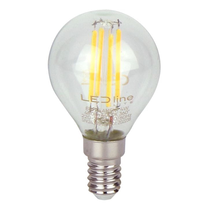 Żarówka LED LITE Filament z mocowaniem E14 w kształcie kulki marki LED-LINE do dekoracyjnego oświetlenia pomieszczeń neutralną barwą światła.