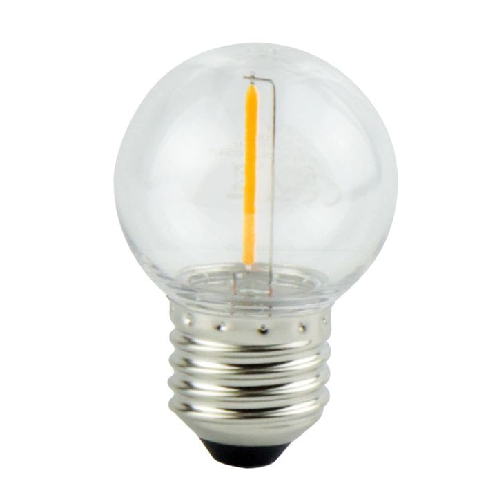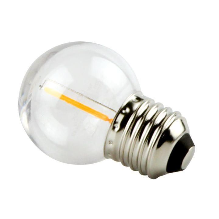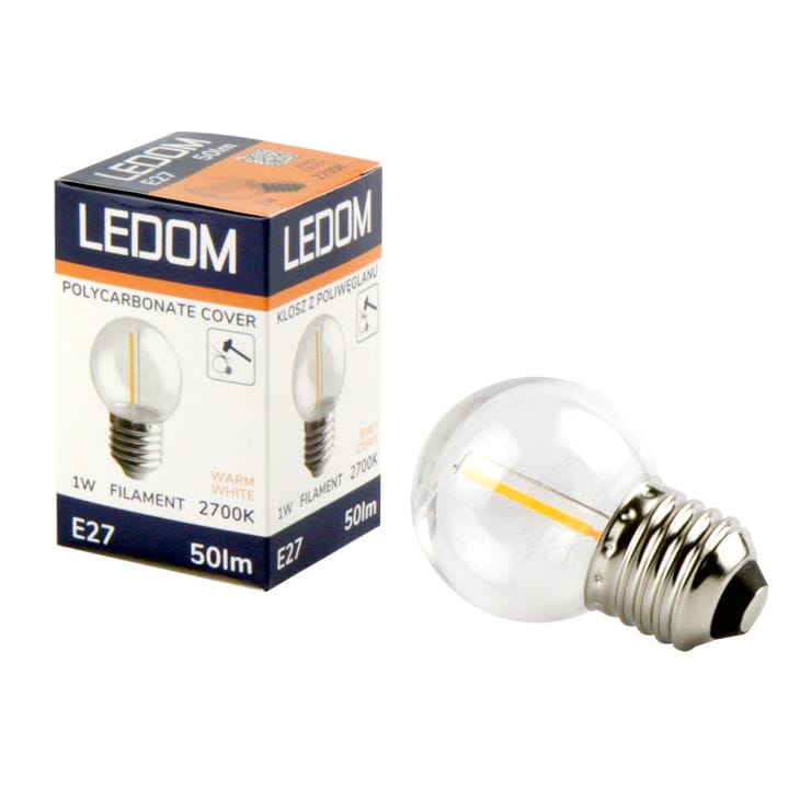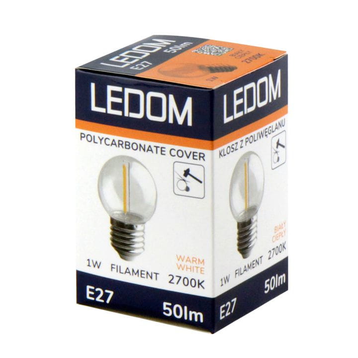 Energooszczędna żarówka LED Filament z gwintem E27 G45 o małej mocy 1 Watt, jasności 50 lumenów, z kątem świecenia 270°, w temperaturze barwowej 2700K.