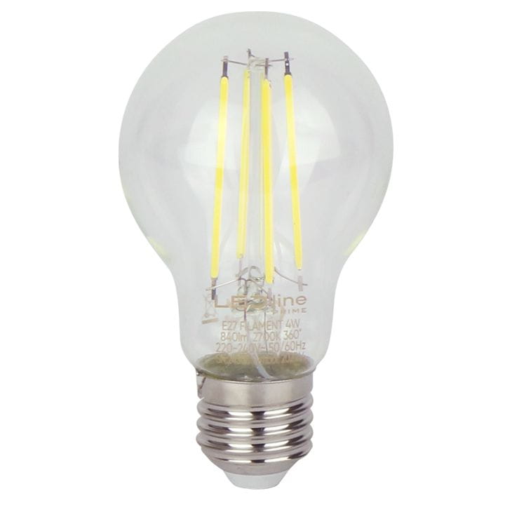 Ozdobna żarówka LED PRIME Filament z mocowaniem E27 A60 o mocy 4 Watt, jasności 840 lumenów, z kątem świecenia 360°, o temperaturze barwowej 4000K.