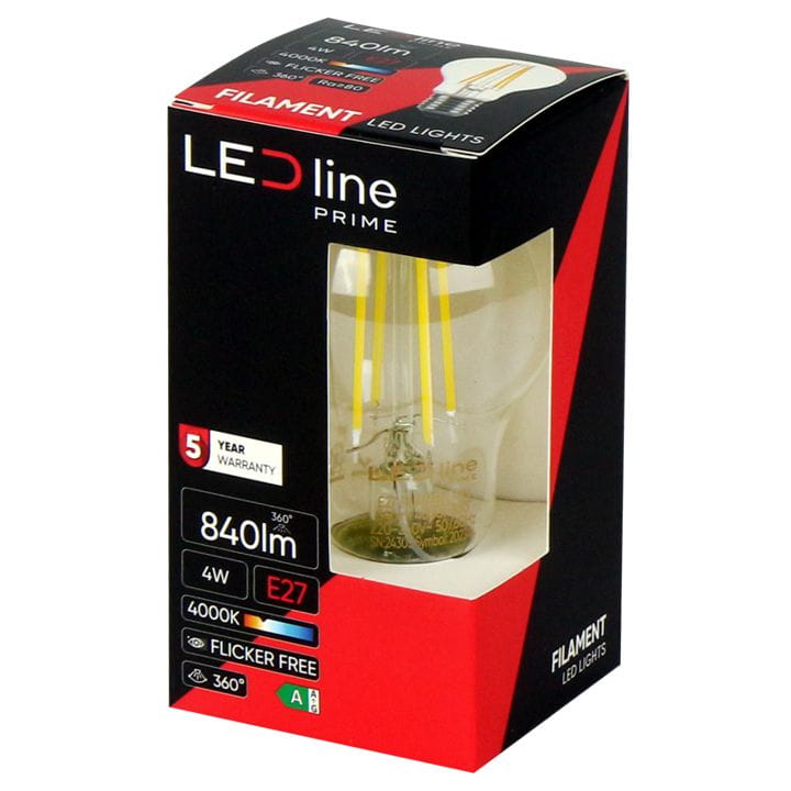 Energooszczędna żarówka LED Filament E27 w kształcie kuli z serii PRIME marki LEDLINE do oświetlania pomieszczeń neutralną barwą światła.