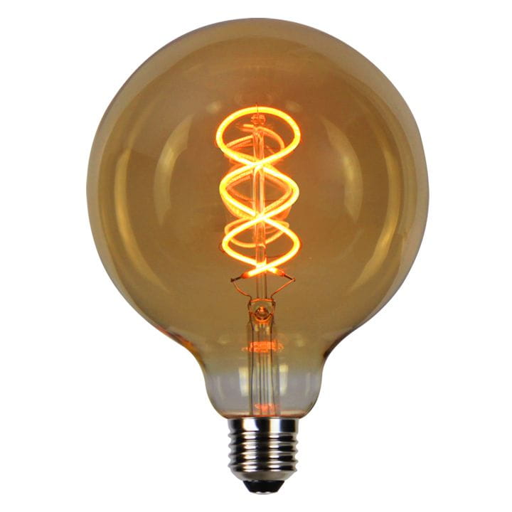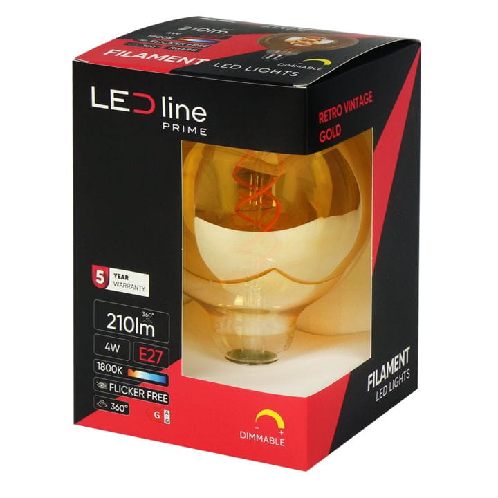 Dekoracyjna złota żarówka LED PRIME Filament G125 z gwintem E27 o mocy 4W, strumieniu świetlnym 840 lumenów, w temperaturze barwowej 1800K.