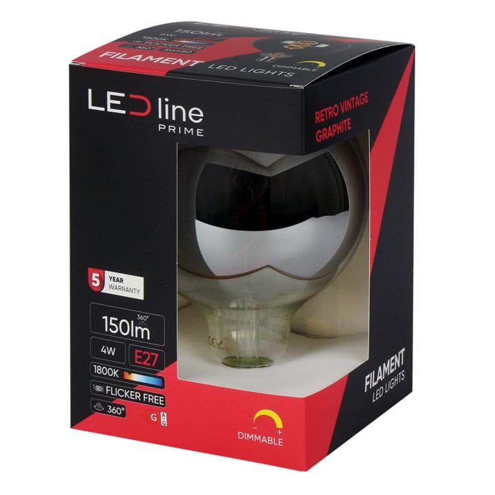 Żarówka LED PRIME Filament G125 z gwintem E27 o mocy 4W, jasności 150 lumenów, w temperaturze barwowej 1800K, z możliwością ściemniania.