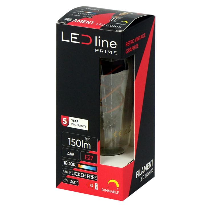 Żarówka LED Filament marki LEDLINE w stylu retro vintage grafit to grafitowa, dekoracyjna żarówka, która swoim kształtem przypomina łzę. Można ją zamontować jako oddzielne źródło światła lub jako część większej instalacji. Żarówka posiada możliwość ściemniania, sprawdzi się jako podświetlenie luster, a także stołów. Może również być częścią dekoracyjną w pomieszczeniu, np. w restauracji.