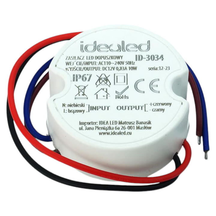 Zasilacz LED mocy 10W na napięcie 12V, do instalacji w puszce 60 mm.
