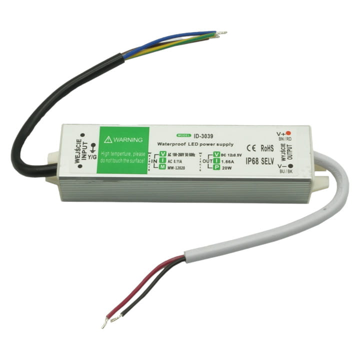 Smukły zasilacz LED z hermetyczną obudową, oferujący moc 20W przy napięciu 12V.