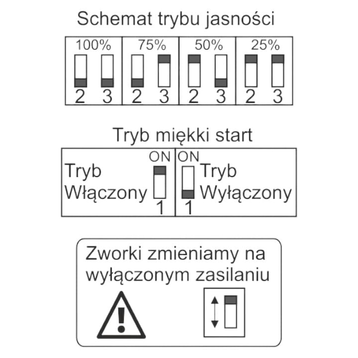 Dostępne są cztery poziomy jasności dla taśm typu SMD: 25%, 50%, 75% oraz 100%. Dla taśm typu COB dostępne są trzy poziomy jasności: 50%, 75% i 100%.