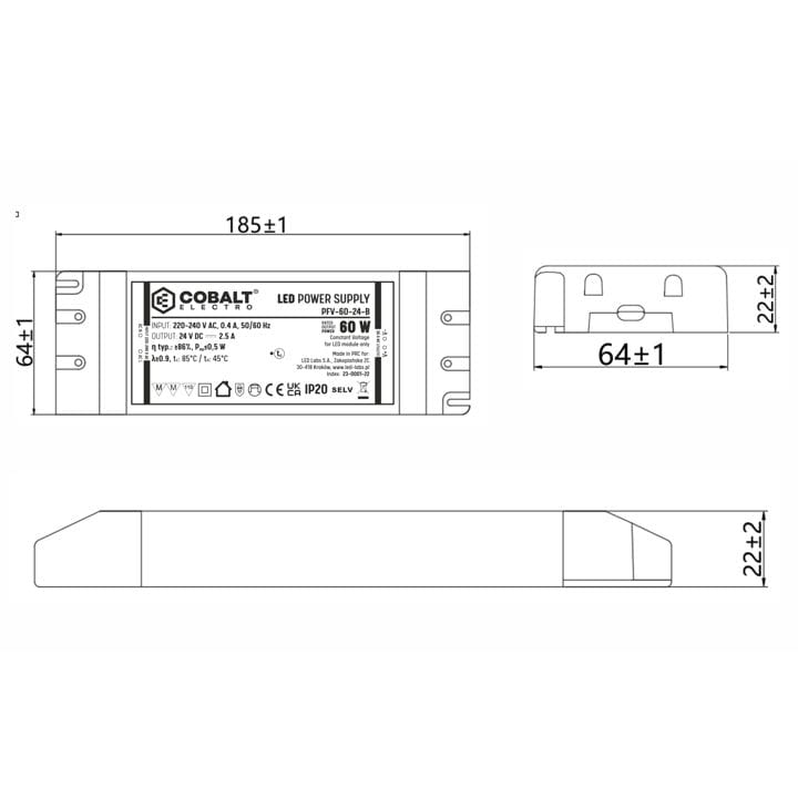 Płaski zasilacz LED CobaltElectro PFV-60-24 o mocy 60 Watt na 24V DC.